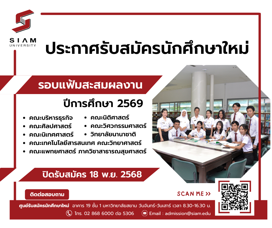 ประกาศมหาวิทยาลัยสยามเรื่อง การรับสมัครคัดเลือกบุคคลเพื่อเข้าศึกษาระดับปริญญาตรีโดยวิธียื่นแฟ้มสะสมงาน Portfolio ประจำปีการศึกษา 2569