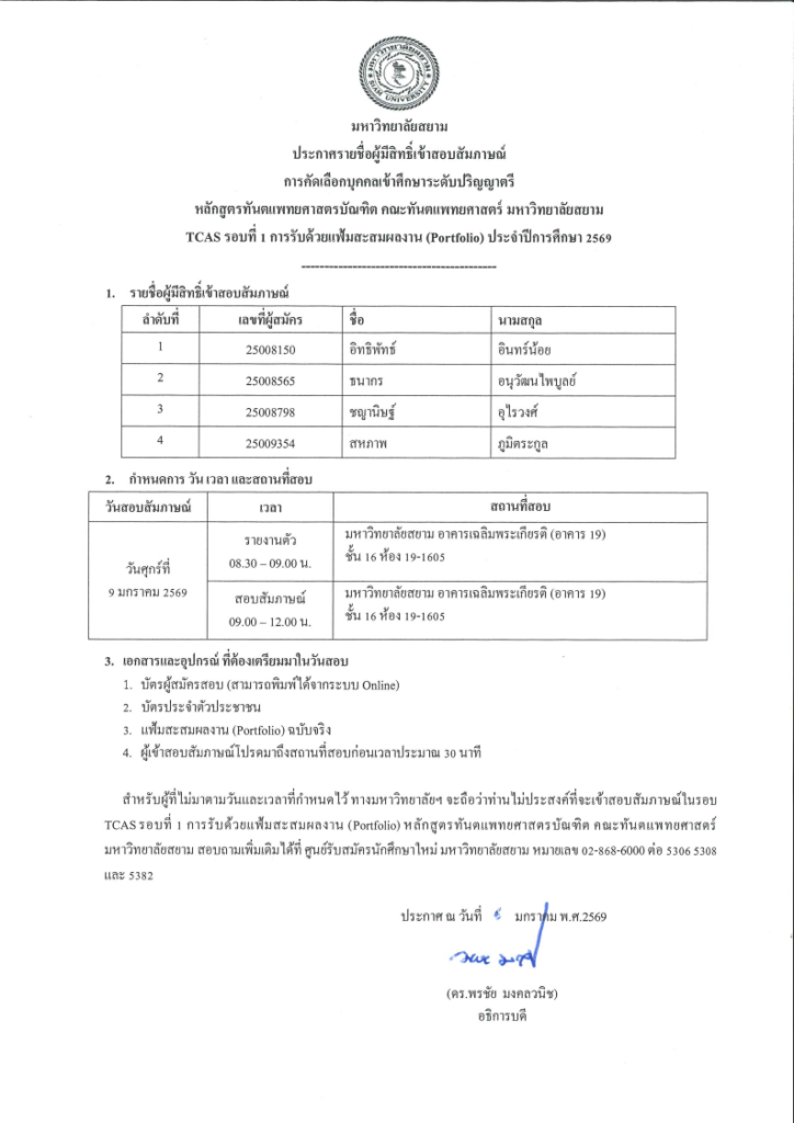 ประกาศรายชื่อผู้มีสิทธิ์เข้าสอบสัมภาษณ์การคัดเลือกบุคคลเข้าศึกษาระดับปริญญาตรี หลักสูตรทันตแพทยศาสตรบัณฑิต คณะทันตแพทยศาสตร์ มหาวิทยาลัยสยาม TCAS รอบที่ 1 การรับด้วยแฟ้มสะสมผลงาน (Portfolio) ประจำปีการศึกษา 2569 Share: