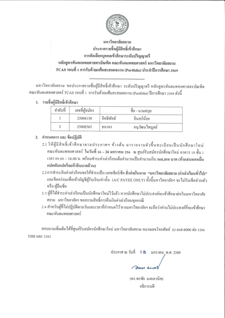 ประกาศรายชื่อผู้มีสิทธิ์เข้าศึกษาการคัดเลือกบุคคลเข้าศึกษาระดับปริญญาตรีหลักสูตรทันตแพทยศาสตรบัณฑิต คณะทันตแพทยศาสตร์ มหาวิทยาลัยสยามTCAS รอบที่ 1 การรับด้วยแฟ้มสะสมผลงาน (Portfolio) ประจำปีการศึกษา 2569 Share:
