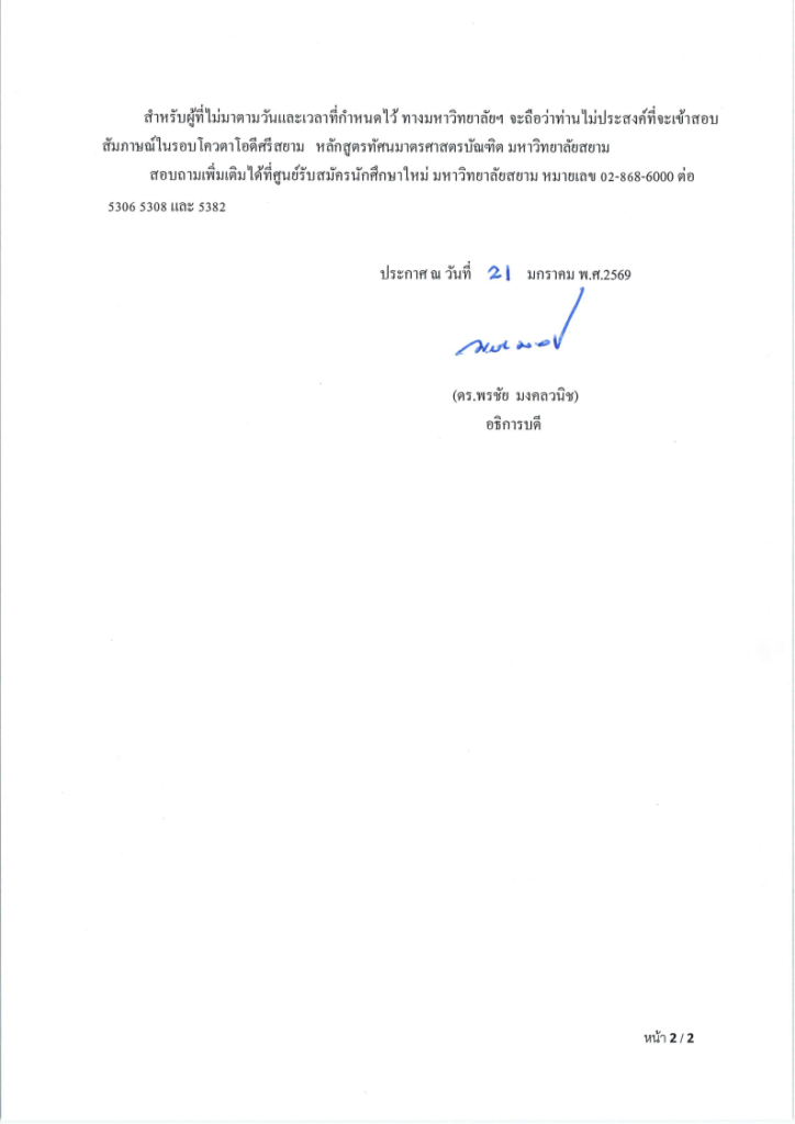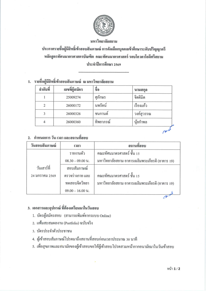 ประกาศรายชื่อผู้มีสิทธิ์เข้าสอบสัมภาษณ์ การคัดเลือกบุคคลเข้าศึกษาระดับปริญญาตรีหลักสูตรทัศนมาตรศาสตรบัณฑิต คณะทัศนมาตรศาสตร์รอบโควตาโอดีศรีสยาม ประจำปีการศึกษา 2569