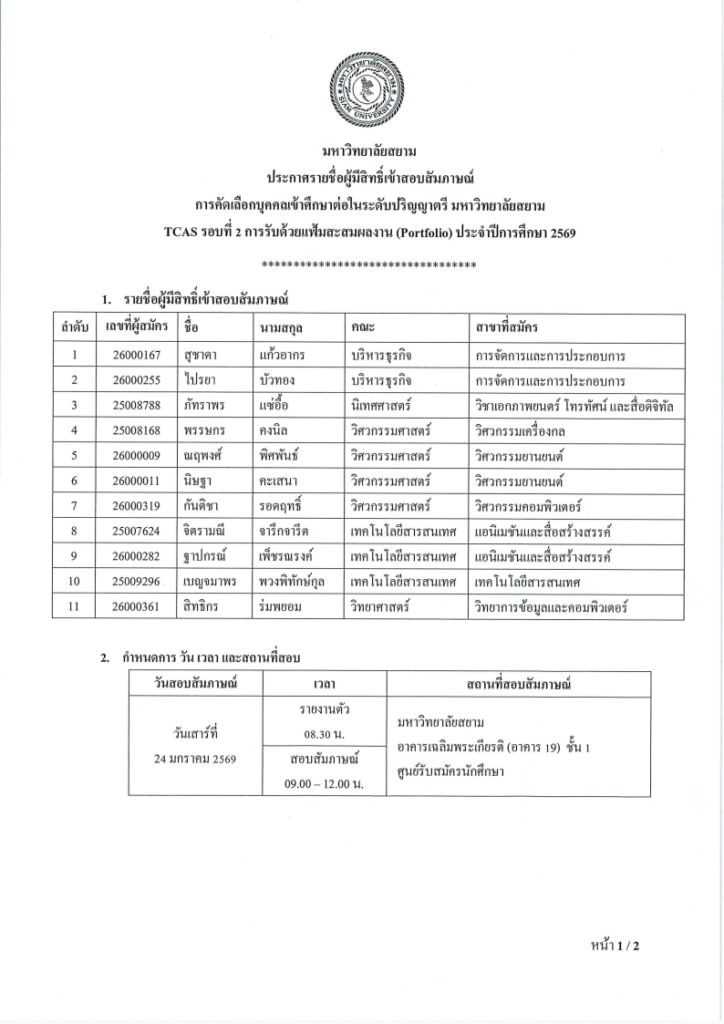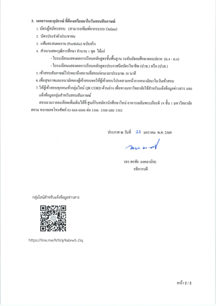 ประกาศรายชื่อผู้มีสิทธิ์เข้าสอบสัมภาษณ์การคัดเลือกบุคคลเข้าศึกษาต่อในระดับปริญญาตรี มหาวิทยาลัยสยามTCAS การรับด้วยแฟ้มสะสมผลงาน (Portfolio) รอบที่ 2 ประจำปีการศึกษา 2569 เข้ากลุ่ม Line สำหรับผู้เข้าสัมภาษณ์ Share: