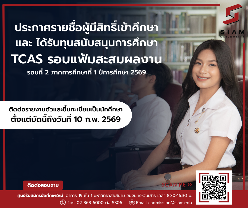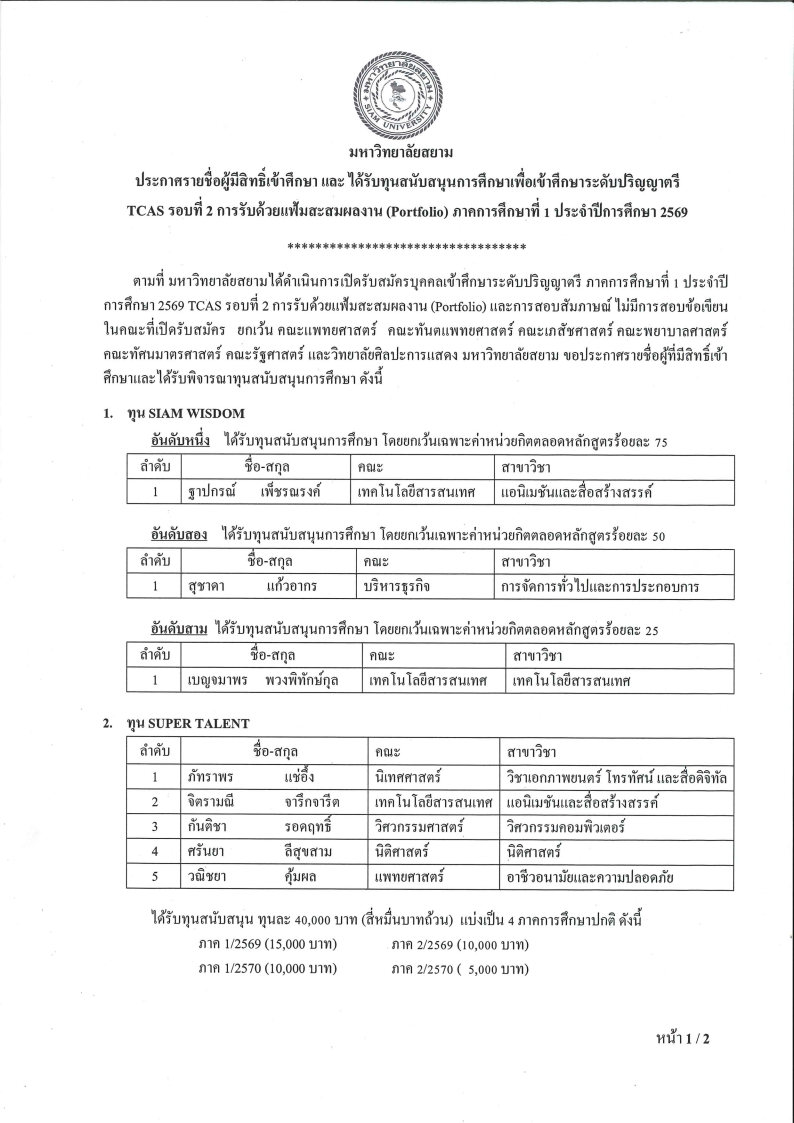 ประกาศรายชื่อผู้มีสิทธิ์เข้าศึกษา และ ได้รับทุนสนับสนุนการศึกษาเพื่อเข้าศึกษาระดับปริญญาตรีTCAS การรับด้วยแฟ้มสะสมผลงาน (Portfolio) รอบที่ 2 ภาคการศึกษาที่ 1 ประจำปีการศึกษา 2569 Share: