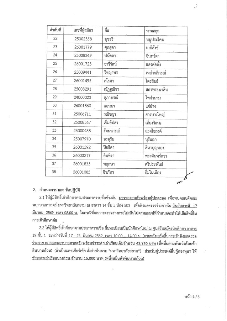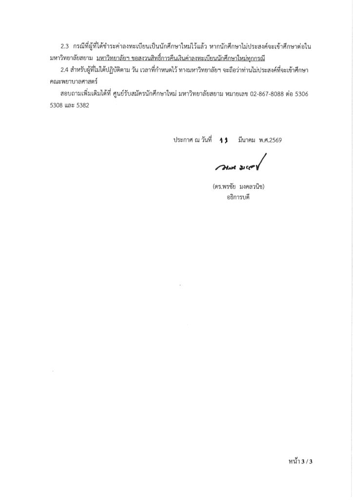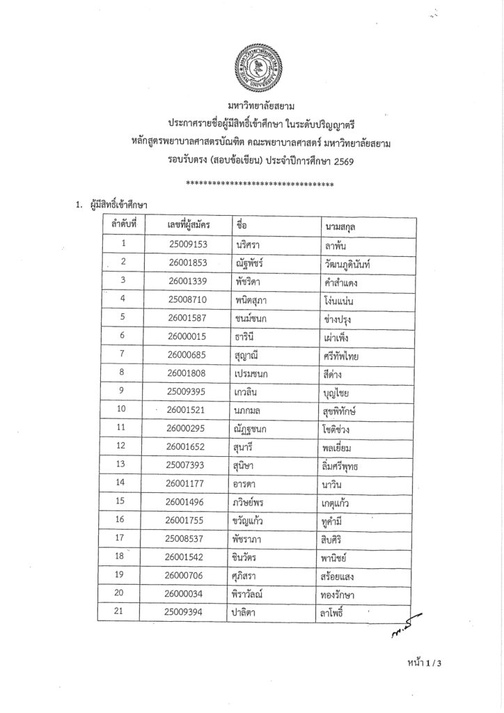 ประกาศรายชื่อผู้มีสิทธิ์เข้าศึกษา ในระดับปริญญาตรีหลักสูตรพยาบาลศาสตรบัณฑิต คณะพยาบาลศาสตร์ มหาวิทยาลัยสยามรอบรับตรง (สอบข้อเขียน) ประจำปีการศึกษา 2569