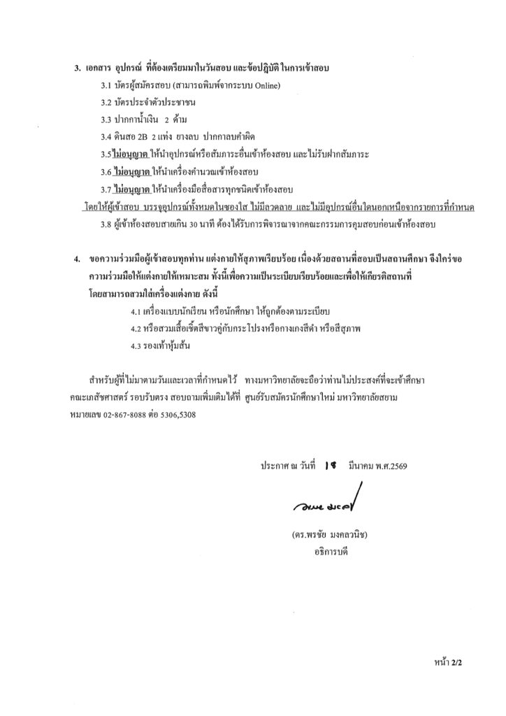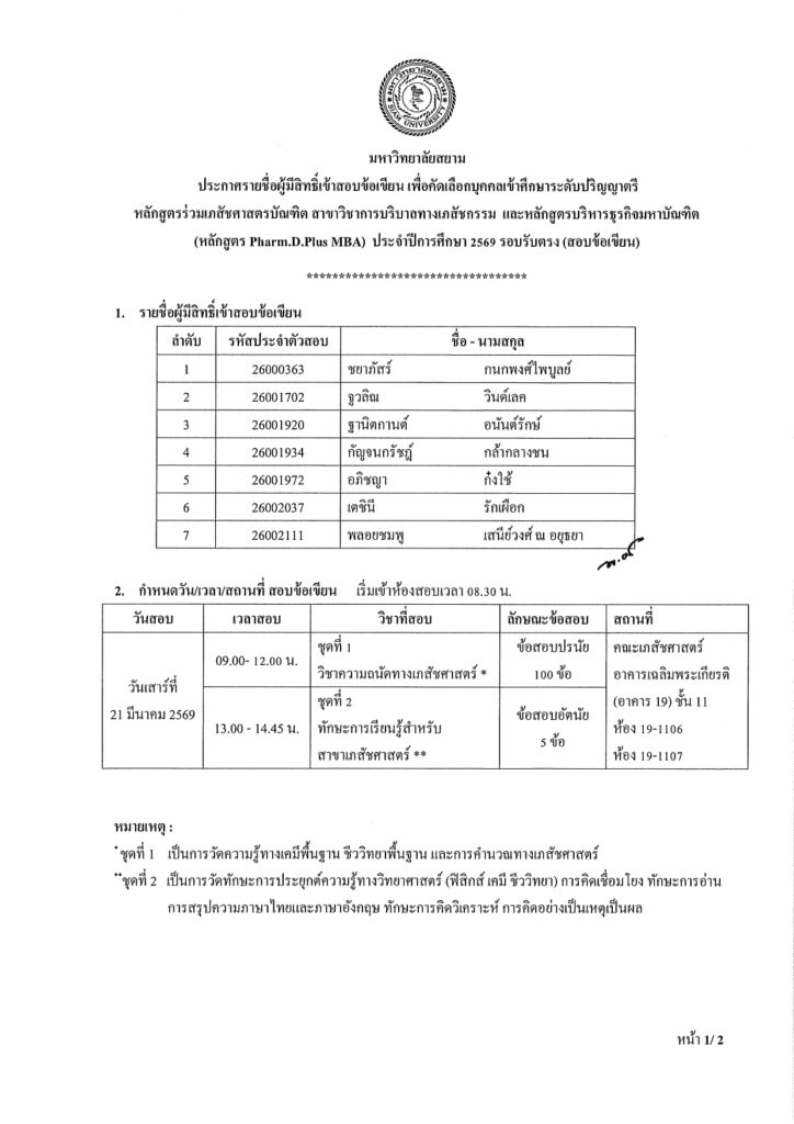 ประกาศรายชื่อผู้มีสิทธิ์เข้าสอบข้อเขียนเพื่อคัดเลือกบุคคลเข้าศึกษาระดับปริญญาตรีหลักสูตรร่วมเภสัชศาสตรบัณฑิต สาขาวิชาการบริบาลทางเภสัชกรรมและหลักสูตรบริหารธุรกิจมหาบัณฑิต(หลักสูตร Pharm.D.Plus MBA) ประจำปีการศึกษา 2569 รอบรับตรง (สอบข้อเขียน) Share: