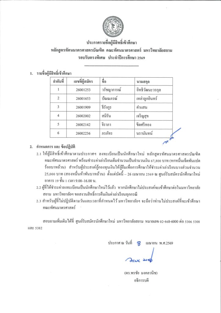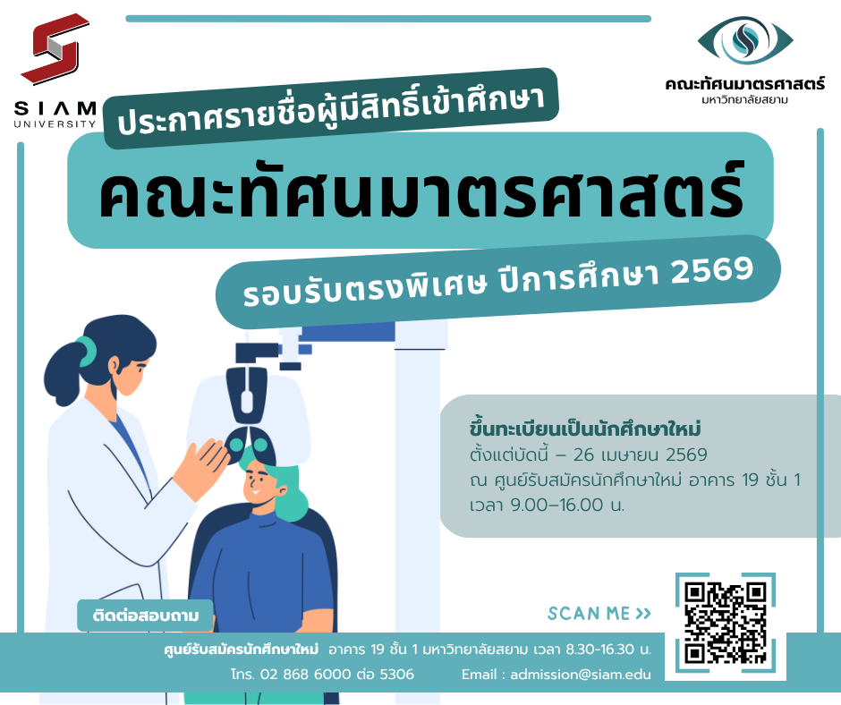ประกาศรายชื่อผู้มีสิทธิ์เข้าศึกษา หลักสูตรทัศนมาตรศาสตรบัณฑิต คณะทัศนมาตรศาสตร์ มหาวิทยาลัยสยาม รอบรับตรงพิเศษ ประจำปีการศึกษา 2569 Share: