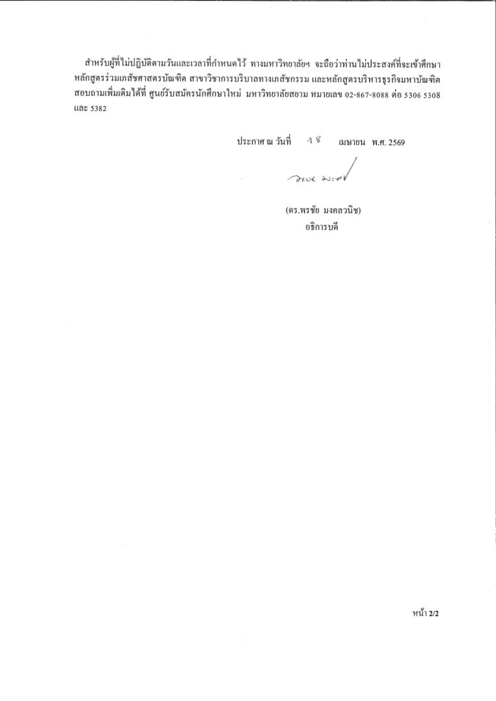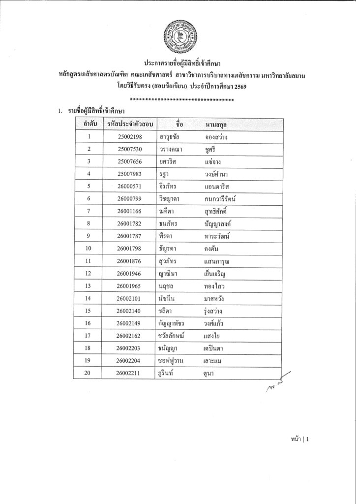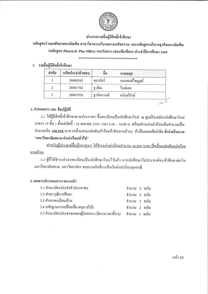 ประกาศรายชื่อผู้มีสิทธิ์เข้าศึกษา คณะเภสัชศาสตร์ โดยวิธีรับตรง (สอบข้อเขียน) ปีการศึกษา 2569 ประกาศรายชื่อผู้มีสิทธิ์เข้าศึกษา หลักสูตรเภสัชศาสตรบัณฑิต คณะเภสัชศาสตร์ สาขาวิชาการบริบาลทางเภสัชกรรม โดยวิธีรับตรง (สอบข้อเขียน) ประจำปีการศึกษา 2569+ ประกาศรายชื่อผู้มีสิทธิ์เข้าศึกษา หลักสูตรร่วมเภสัชศาสตรบัณฑิต สาขาวิชาการบริบาลทางเภสัชกรรม และหลักสูตรบริหารธุรกิจมหาบัณฑิต (หลักสูตร Pharm.D. Plus MBA) รอบรับตรง (สอบข้อเขียน) ประจำปีการศึกษา 2569+ Share: